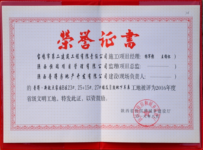 2016年省級文明工地(西藏民族學(xué)院證書)